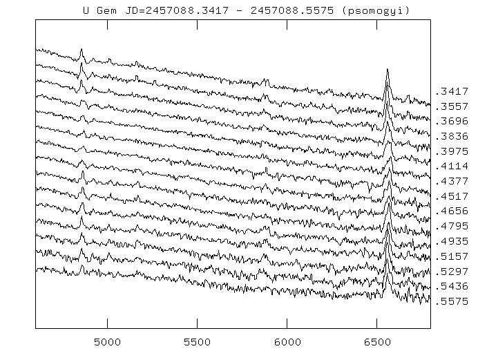 Great observations and presentations! I wonder if eclipsing nature of U Gem system might have an impact on observed spectra. Every 4h and 15 minutes the secondary red and cool star eclipse the white dwarf (and all the disk?). Photometrically the eclipse lasts 20-25 minutes. Can we expect, in time resolved spectra (like Peter's 6 march sequence), a continuum evolving in some way toward a cool star profile? From light curves it seems that minima have smaller amplitude during the ouburst than in quiescence. May be a lot of the emitting part extends beyond the cool star shape?