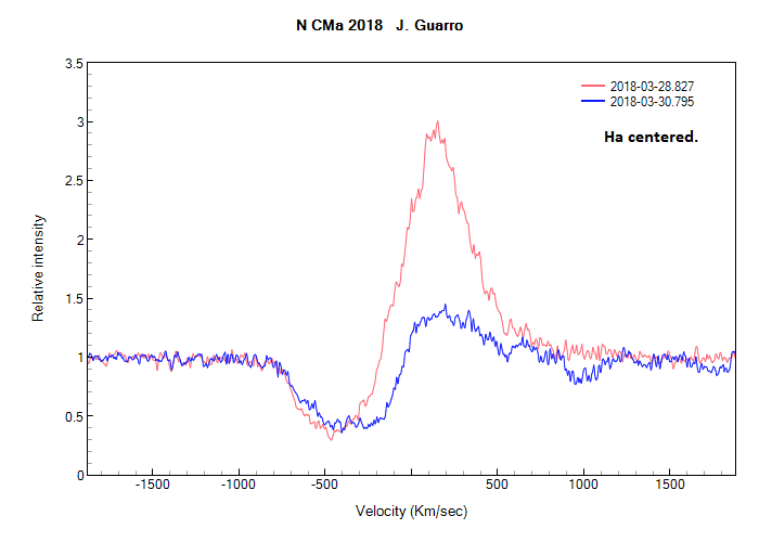 This past night, I was able to observe the N CMa2018. I have been able to make two integrations of 2000 seconds with the LINX of Sta. Maria, before the sky clouded and 5 integrations also of 2000 seconds, with MUSSOL de Piera. The blue graph is the result of the sum of all seven.
