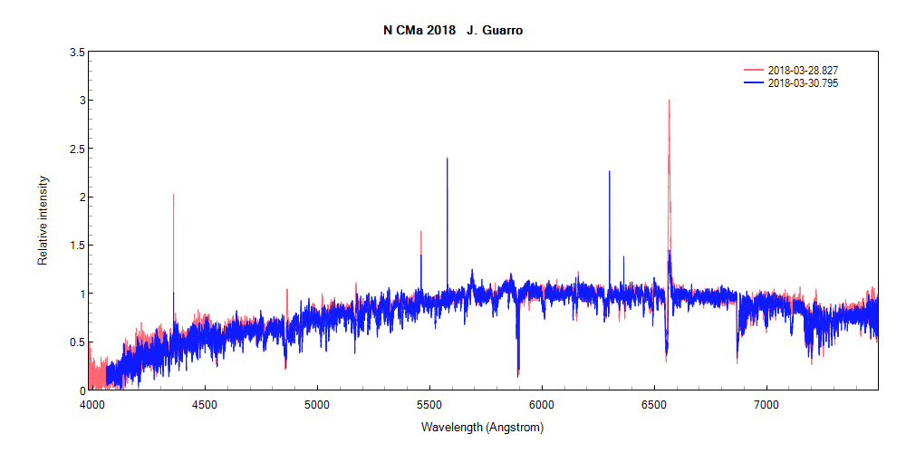 Here is my data on N CMa 2018 from last night just after dusk. I used HD041692 again for a Reference star. In just 3 nights since the last data the airmass spread has increased between this star and the target at the mid point of each image sequence. But it was still the best positioned Miles star to use as a reference. The H Balmer emission lines look to have diminished considerably since my first data on 2018-03-27.126. The Sodium Na lines are however much more pronounced.