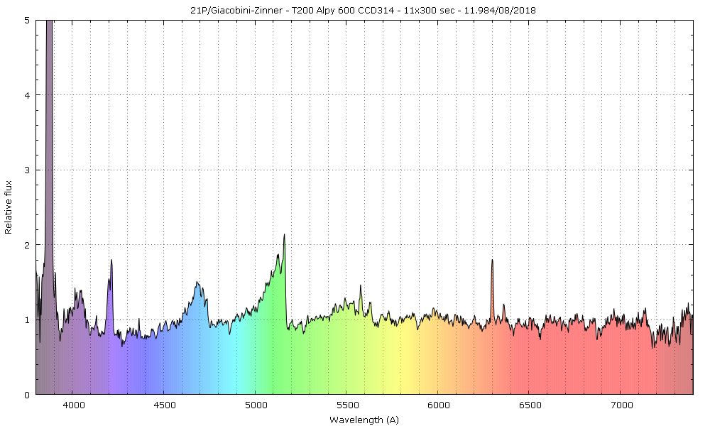 Le spectre avec l'Alpy sur un T200, 11x300 sec en guidant sur une étoile et en rattrapant manuellement a chaque pose, la fente glisse sur le noyau et la coma et on obtient un spectre intégré