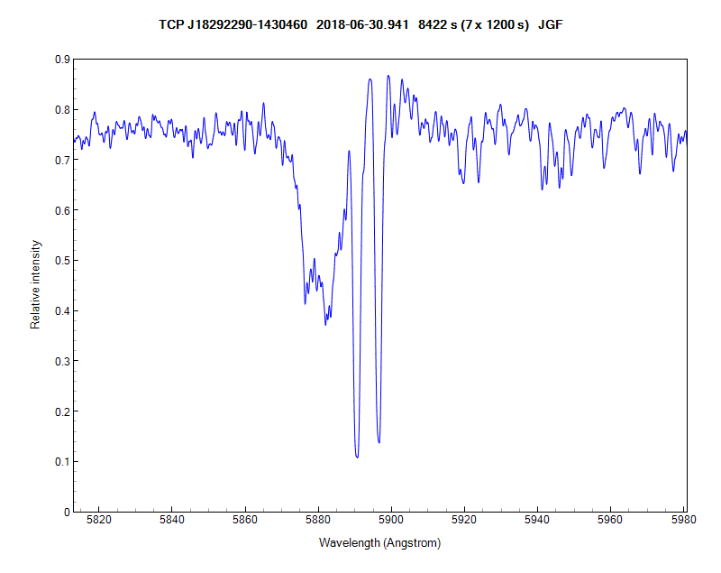 Spectra were taken concurrently with a C11 + LISA between 23.25 UT and 00.25 UT. R=1064. A mean V mag of 10.63 was adopted to flux calibrate the spectrum. As the average altitude of the nova was only 22 deg, atmospheric correction may be suspect.