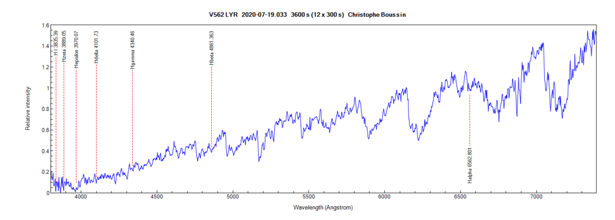 V562 Lyr on July 19th 2020 (identification of Balmer lines from PlotSpectra)