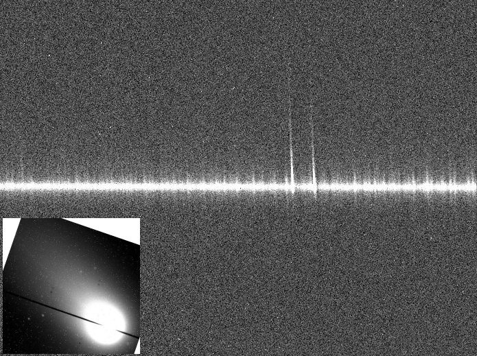 Tout d’abord une vue en fausse couleur de la caméra de guidage pour mettre en évidence le large halo de lumière de la comète sur toute la longueur de la fente. Dans ces conditions, le fond du ciel est difficile à isoler.