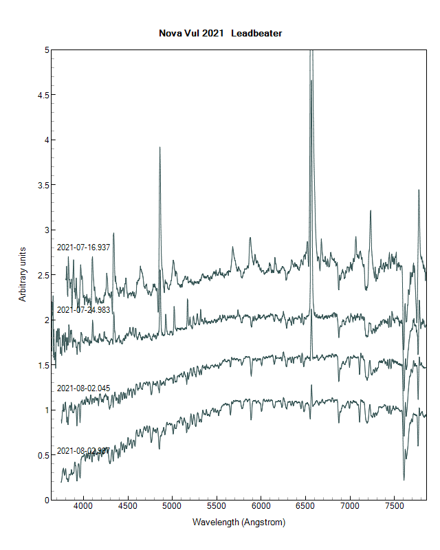 I took a new spectrum of Nova Vul 2021, five days after the first one. The continuous spectrum and luminosity have increased (Magnitude: 12 to 10.4). Spectral lines have also varied: In the last spectrum the only line in emission is H-alpha, but with a relatively diminished intensity. The rest of the Balmer lines as well as the iron lines (which were in emission five days ago) are now, all of them, in absorption. I suppose it must be the relationship between what happens in the stellar wind of the nova and in the shell (now more expanded). Is that so?