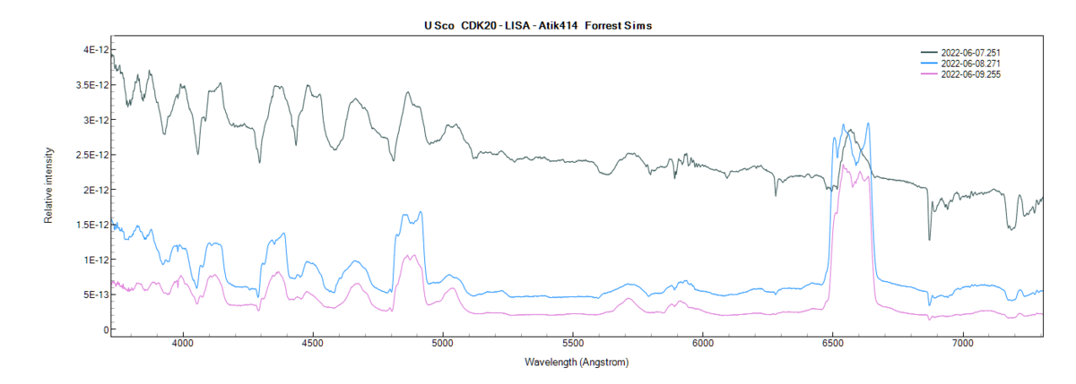 Adding another night, here is a comparison of flux calibrated spectra over three nights as the V magnitude dropped from 7.957 +/- 0.072 to 10.267+/- 0.025 taken with a LISA and processed using ISIS.