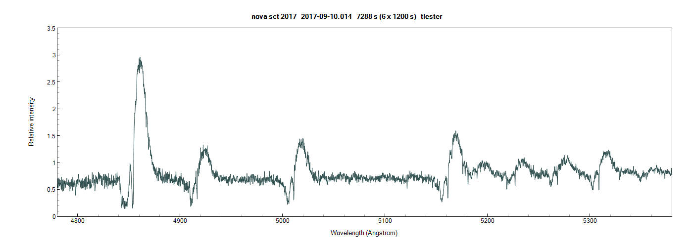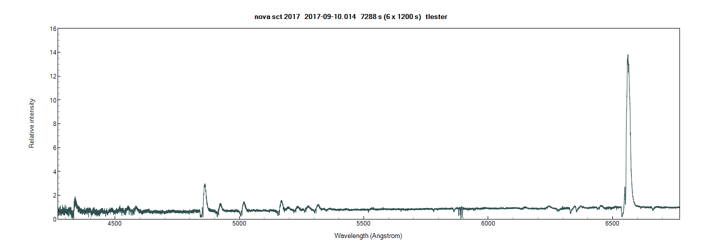 Here is nova sct on the 10th captured with my echelle spectrograph at R = 12000. It is still brightening (V mag = 9.5 on AAVSO) but it is low in the sky and difficult to get good S/N at the blue end..
