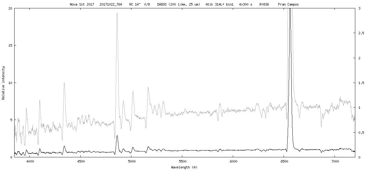 Salut, juste Joan, même la nuit dernière 23-10-2017, avec de nombreux problèmes météorologiques, j'ai réussi à faire un spectre à la nova.Voici son profil spectral et une comparaison avec 21-10-2017.