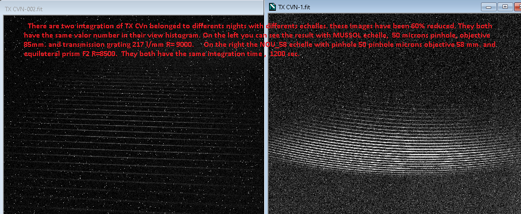 I don't find much difference of sensitivity between, the NOU_T, ( with prism F2, Nikon 85mm. and direct to telescope ), than the MUSSOL, ( with transmission grating, Ashai Pentax 85mm. and optical fiber ).