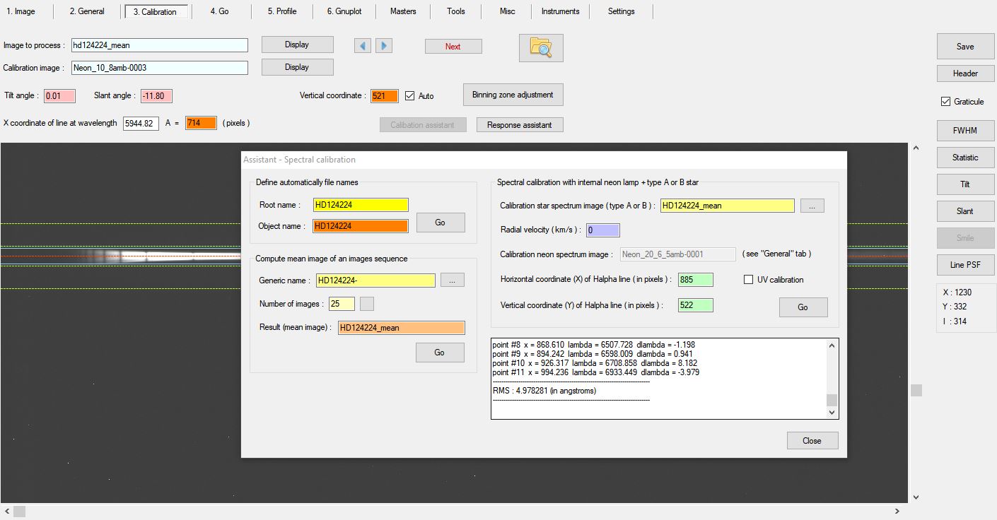.lst file - this is a mystery. I have tried to calibrate with a variety of calibration images taken at different temperatures last night. I adjusted the x-pixel for 5944 as well. The RMS using the .lst file fails to achieve a reasonable match - even when using the same lines as you have suggested. So for example, I achieved RMS of 12.8 using the same .lst file. However, refining that with the Calibration Assistant and setting the Ha wavelength I achieve an RMS of 0.22. It is very odd.