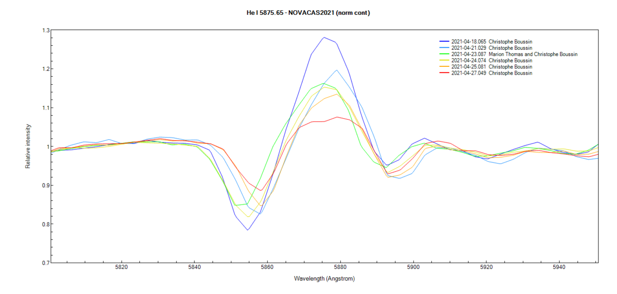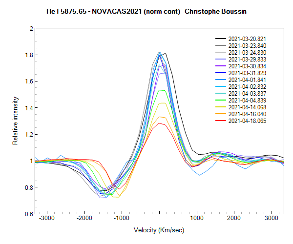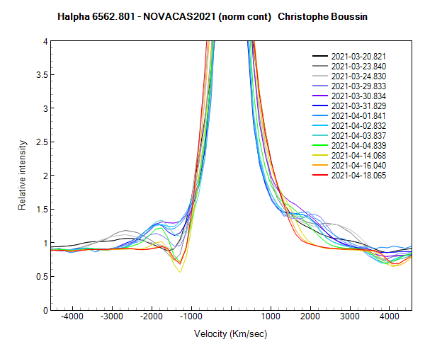 -2000 km/s was EW < 0.010 A) while on 2021 Apr. 6.7UT a strong, detached absorption was present (0.5 A) with a minimum at -1200 km/s (FWZI ~ 500 km/s), confirmed on Apr. 7.7UT). The absorption was both stronger (2.3