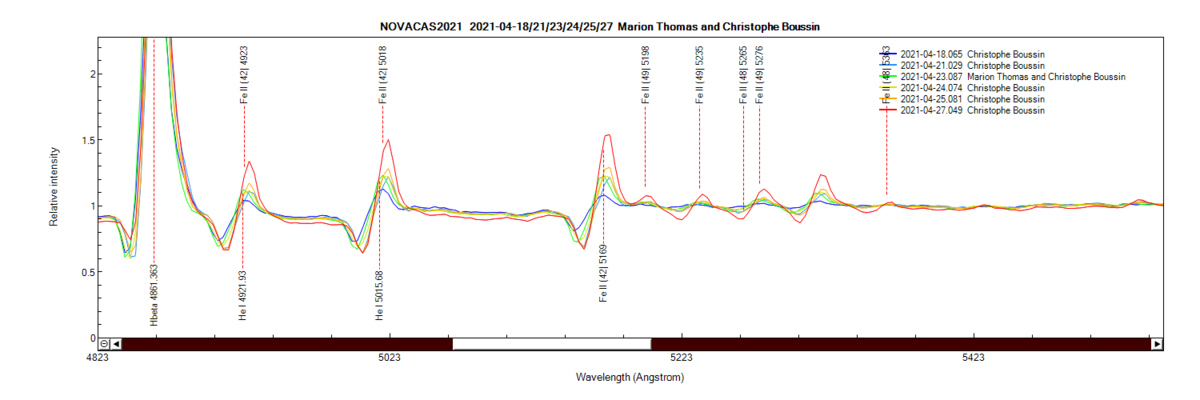 The last spectrum to show no evidence for any Fe II absorption was obtained on 2021 Apr. 03.7UT; a very narrow emission at Fe II 5169 (FWZI ~ 100 km/s, vrad ~ 0 km/s) was present but the upper limit to any absorption at vrad>