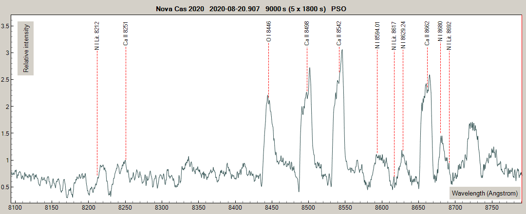 An UVEX (by Shelyak) spectrum of nova Cas (300 g/mm grating, R = 800, ASI183MM camera on Celestron 9.25), for the 21.103 August :