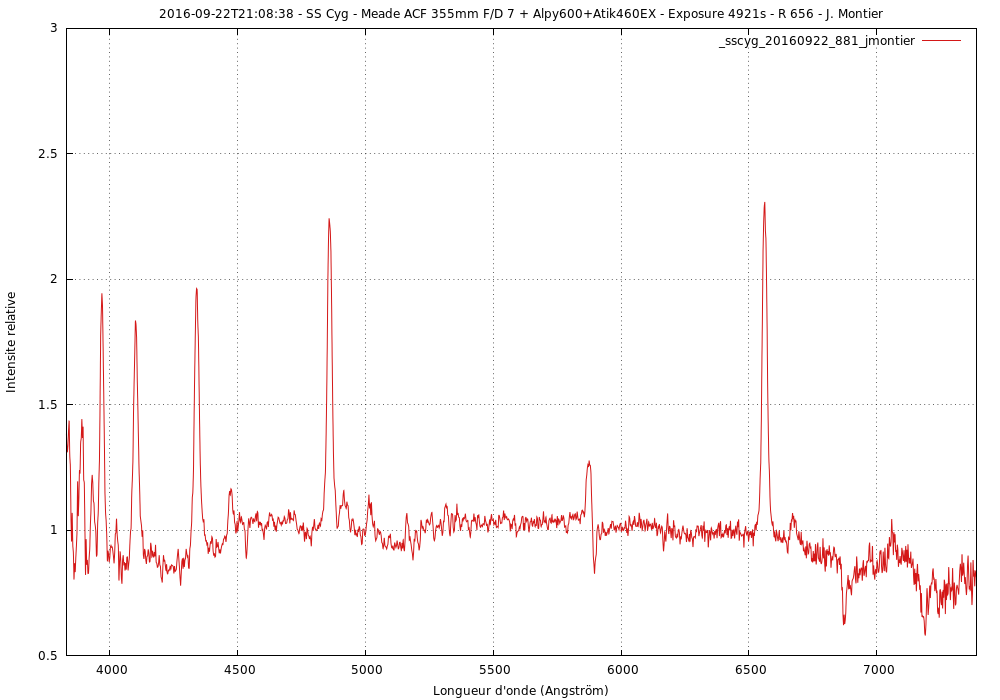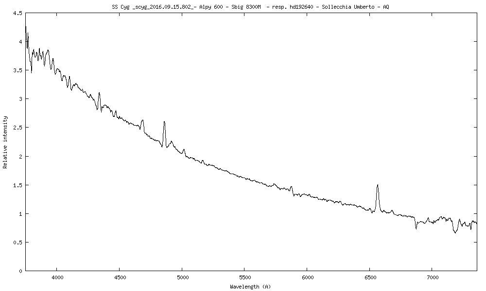 Bonjour, un spectre de SS Cyg du 9/10/2016, en flux absolu, méthode de C Buil (4 spectres) avec la fente spectro-photométrique 23/300 um de l'alpy. L'étoile de référence était 77 Cyg (HD 206644).