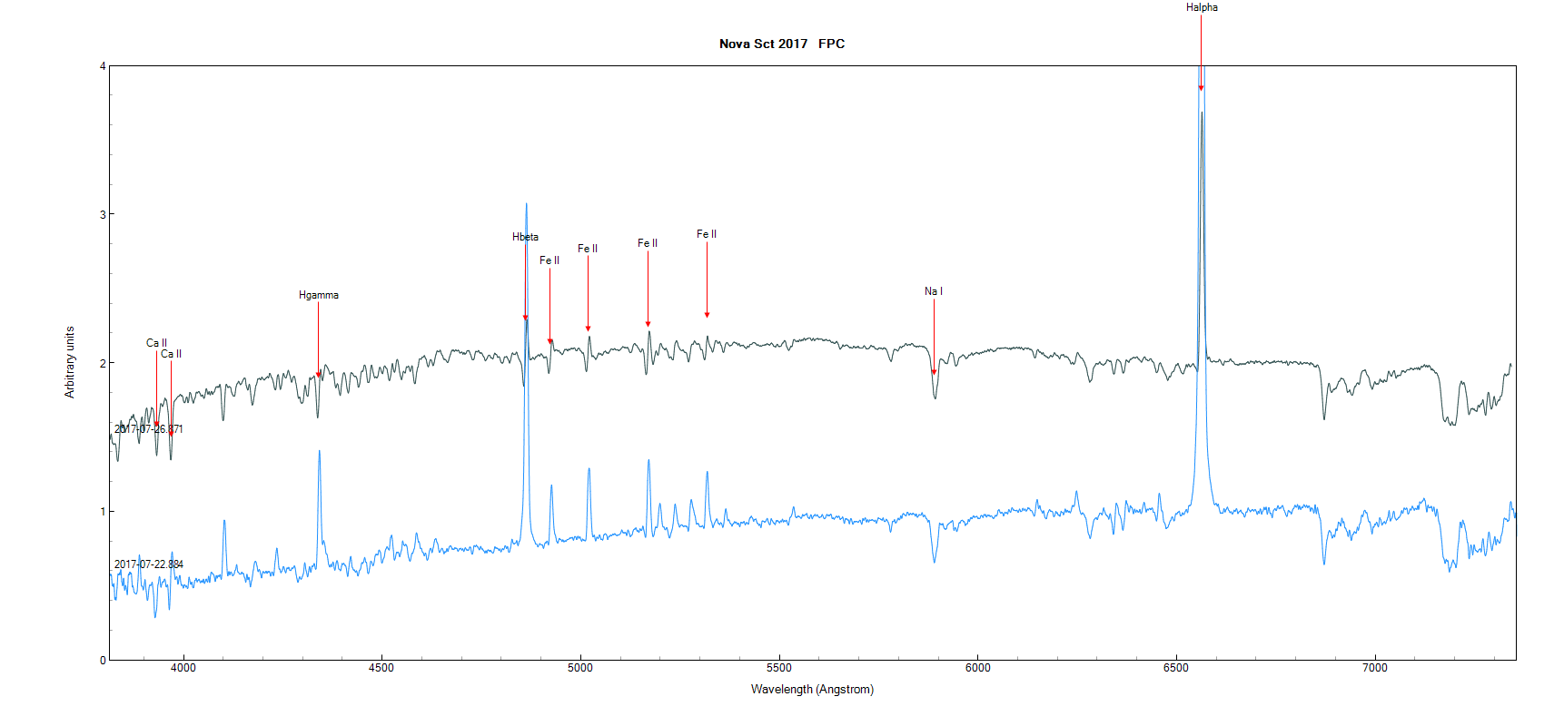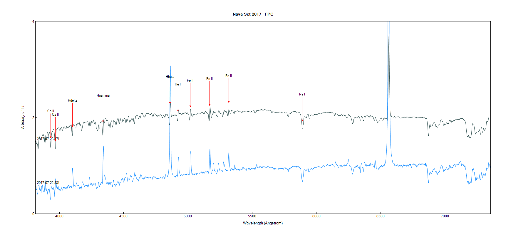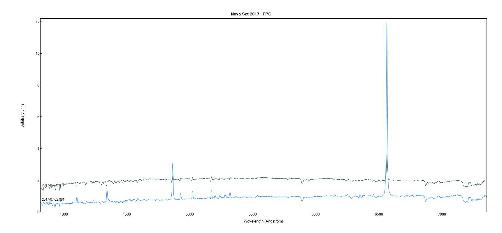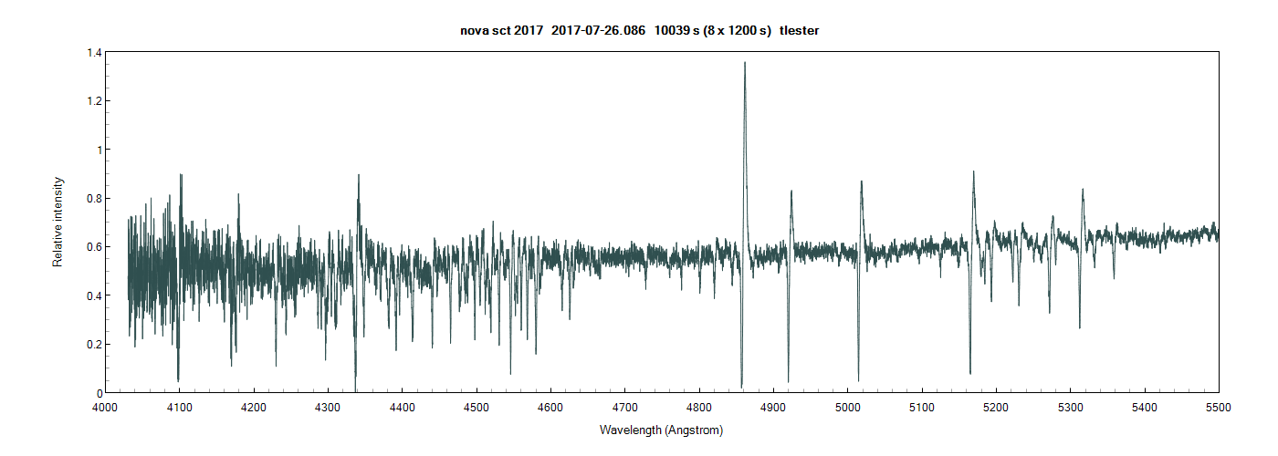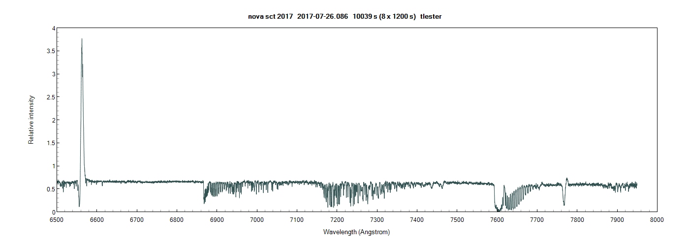 Hi all! Fran, thanks for your comment. Very nice echelle spectrum Tim! I can confirm the extremely high brightness of the nova. Yesterday I measured V mag 9.15 at ~ 21 UT. Even with 1200 l/mm grating, the continuum is very intense and shows clearly the telluric lines in the H-alpha region (removed in the plots below).