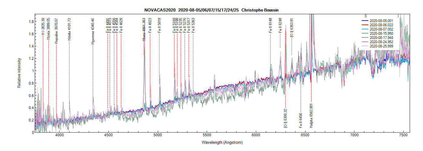 - Nova Cas 2020 on August 5th, 6th, 7th, 15th and 17th and 24th, 2020 (identification of lines from PlotSpectra)