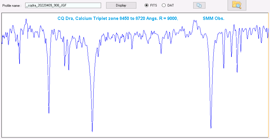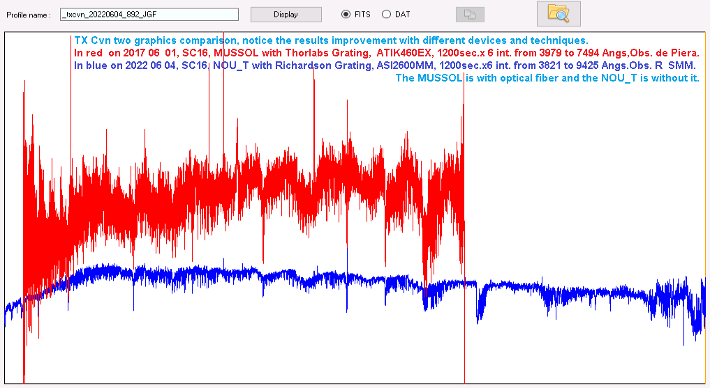 You can see here some CQ Dra graphics that I observed last night, the NOU_T echelle with a NIKON 85mm. F/1.8 objective gives more agility to the observations and its R = 9000 is very useful for analytical measurements with really any difference as the NIKON 135mm. R = 11000 and with the same precision.