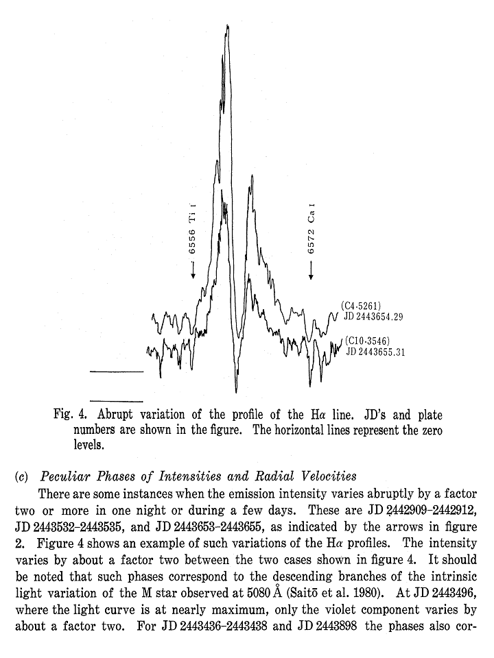 such intensity variations (sometimes by factor two or more) are to expect (see the attached Fig.). This corresponds to intrinsic light variation of the M star observed at 5080 Angstr. (Saito et al. 1980).