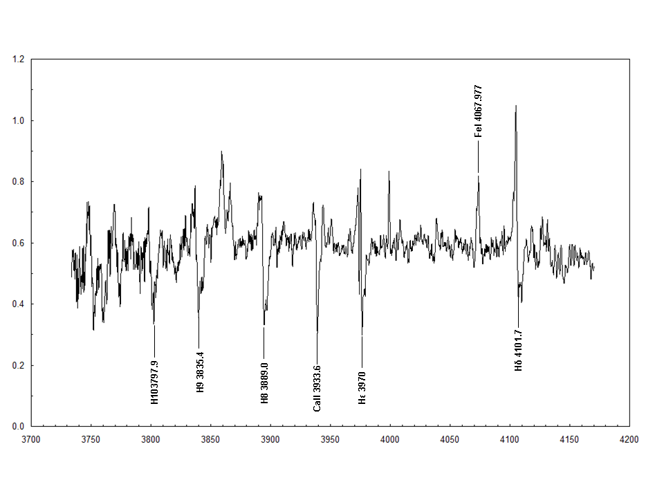 An attempt to capture the near-UV spectral region around Calcium H and K lines with R~4000 on 27.863 aug 2015. In this region the spectrum should be dominated by the hot companion. I don't understand if what appears to be emission lines is actually the continuum between absorption lines... This appears to be the case of space between Ca II H (3968.5A) and H-epsilon (3970.1A).