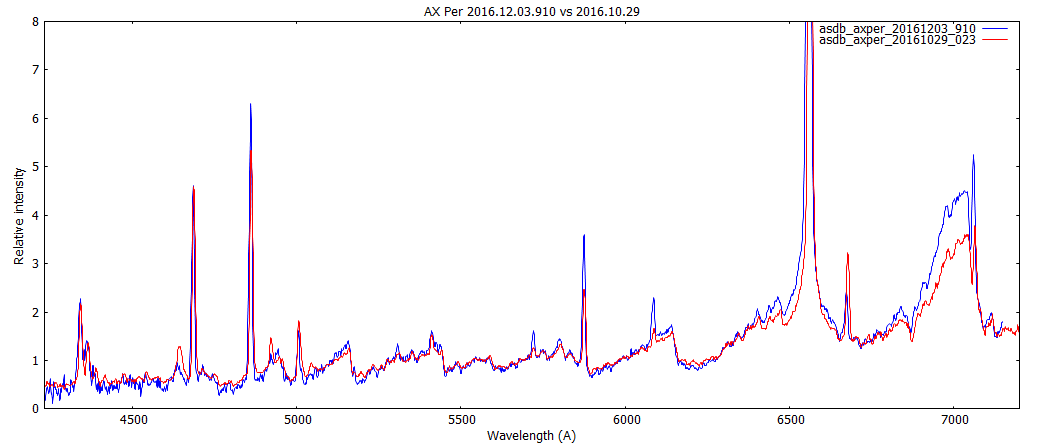 Interesting that continuum did not change during 1 month that much as I expected, contrary to the poor SNR in the blue of my spectrum (made 16 x 600 secs, took The Cas before and after, using the average as a ref.star).