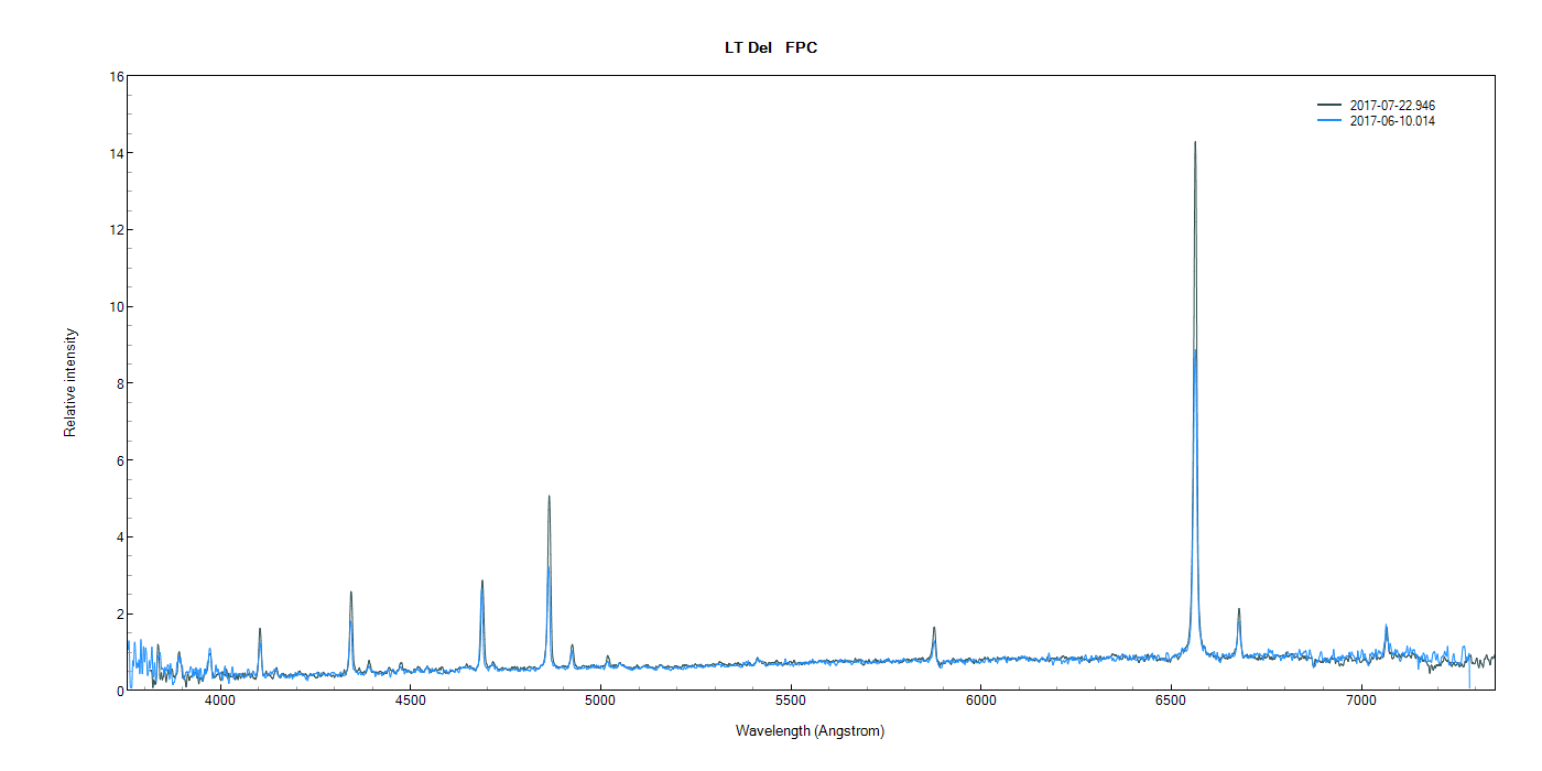 a fresh spectrum from the last night, with full Moon and sparse clouds, but still profitable. Comparing this spectrum with Joan's one, looks like that LT Del continues in altered state, showing intense He I and He II emission lines.