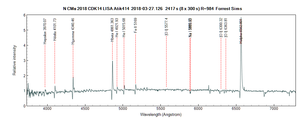 Here is more data from last night. This time I took (5) 600sec exposures. I used HD059612 as the Reference star. There are large changes in the intensities of the absorption and emission lines.