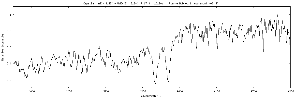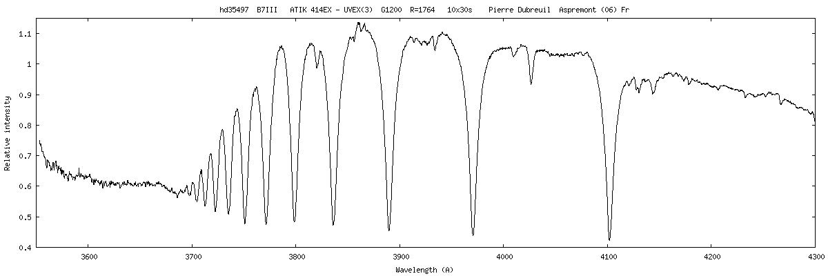 Sur les étoiles visées par Pierre, je pense qu'il y a largement capacité d'arriver vers 3500 A, mais dans le cas des spectres présentés, il y a un choix de calage du spectre (et de rotation du réseau), qui ne permet pas d'aller aussi loin. Je pense que le résultat obtenue par Pierre est caractéristique et que ce centrage est correct pour par exemple observer confortablement la limite de Balmer. Bien sur en allant vers 3400 A, outre les problèmes d'étalonnage potentiel, le RSB diminue bien sur assez rapidement.
