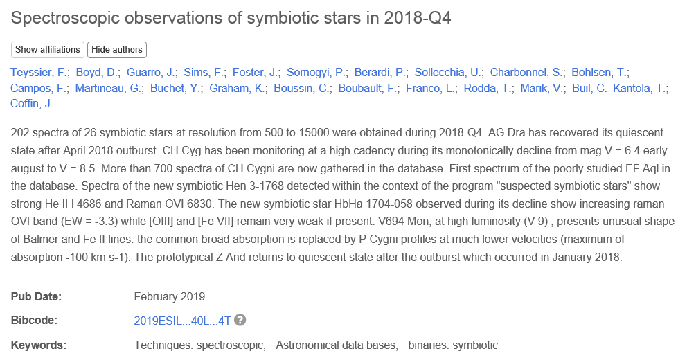 Beyond the personal satisfaction it gives, it's an acknowledgement of a collective and exciting work of passionate people and an invitation to become even more involved in this project of monitoring symbiotic stars !