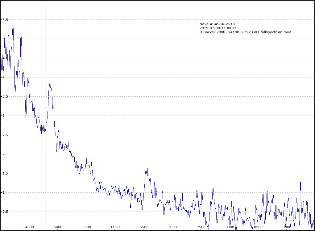 A great result Hamish ! The spectrum definitely shows the characteristic Balmer emission of a classical nova. The green band may be unresolved Fe curtain lines. It shows the power of the simple Star Analyser. I suspect this might be the first Star Analyser spectrum of an extra galactic nova
