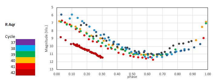 The 3 last pulsations of the Mira with the recent maximum about 1 mag under the previous ones.