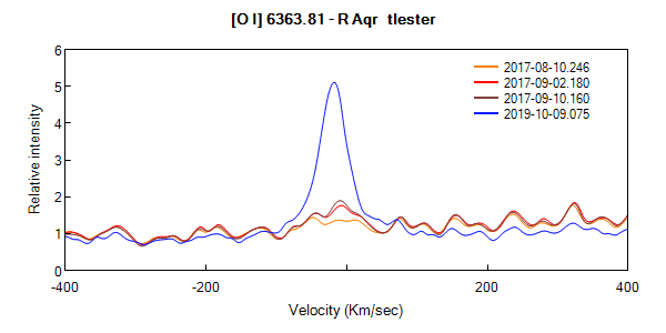 after a long stop due to lack of time to observe, two days ago I could obtain some spectra. Here is a low resolution spectrum of R Aqr compared wiht another taken a year ago. More or less both spectra are taken in the same pulsation phase. The main difference is in the Mira intensity: the continuum is weaker as expected, but I don't appreciate more differences.