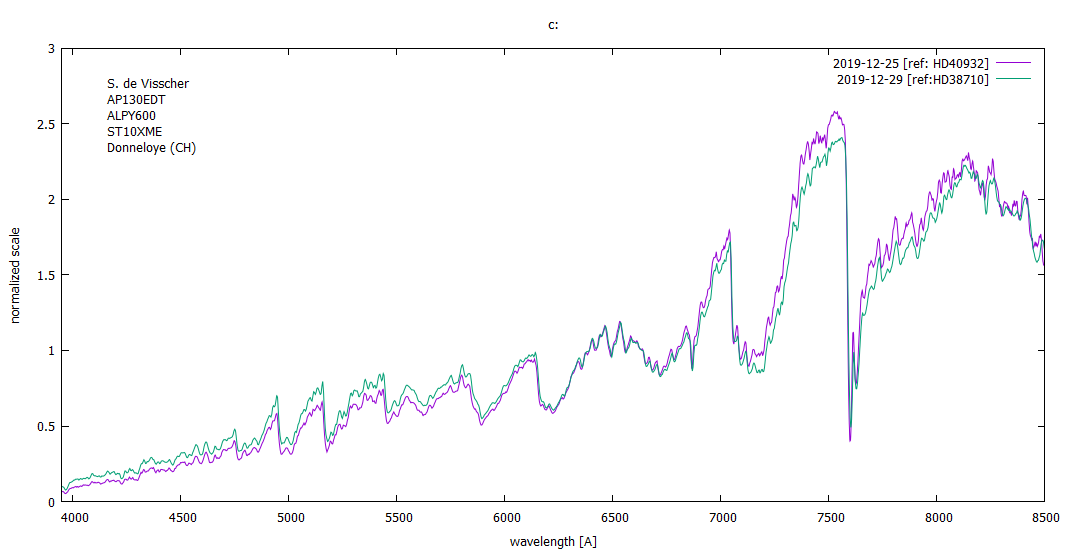 Here are some first results I had with the ALPY600+ST10xme mounted on a AP130EDT (processing with IRIS): I managed to get two spectra on Dec 25th and 29th. Just be careful with my results, these are the first "serious" ones I manage to get with the Alpy, so it might very well be that some things are still not under control (most probably on the processing side).