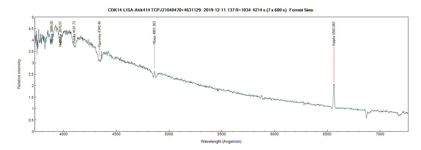 Vitaly Neustroev recently alerted us to the need for photometry and spectroscopy for TCP J21040470+4631129 to cover the period before during and after planned HST observation for the night of April 9/10. But the HST plan changed as TCP J21040470+4631129 has just gone into another superoutburst. David Boyd was able to get photometry on it on the night of March 28 and again on March 31. The V magnitude went from 15.408+/- 0.053 to 10.826+/- 0.018. In this magnitude range it is well in the reach of Alpy and LISA spectrographs. Here is a spectrum from this morning taken with my LISA.