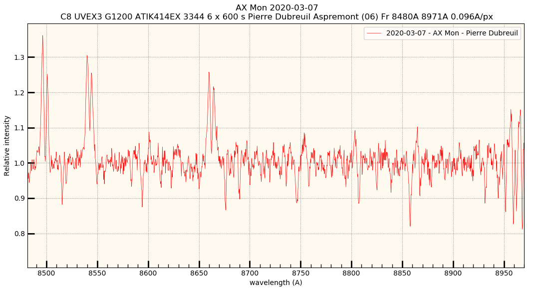 hier soir, malgré'une grosse Lune, après avoir vérifié Bételgeuse (rien de différent ces jours-ci) un nouveau spectre de AX Mon dans le triplet du Calcium .