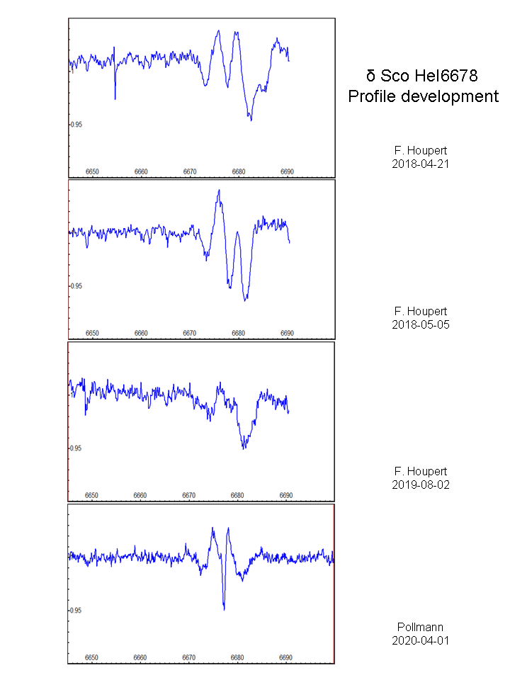 The He1 6678 double peak emission in the spectrum of the Be star delta Sco, has an enormous diagnostic importance in terms of the development of the disk around the primary star.