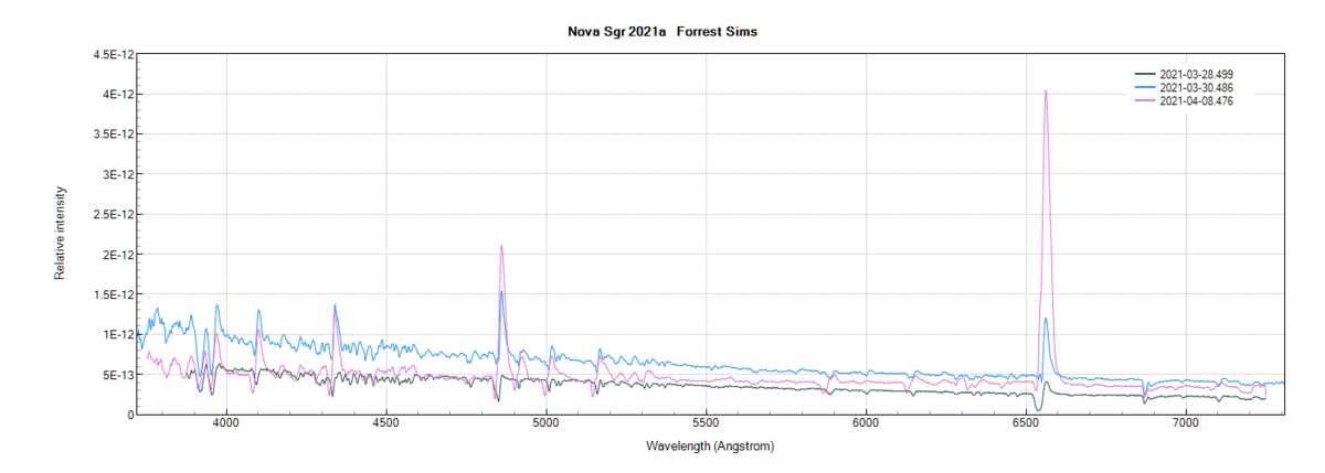 Here are 3 flux calibrated spectra of Nova Sgr 2021a taken with my LISA spectrograph over a 12 day period. The first one was while the nova was still increasing in brightness, the middle spectra was near peak brightness and the last one when the nova was declining in brightness. The AAVSO chart show the V filter photometry to match the spectra. Very nice to have so many Novae to observe. For me Nova Sgr 2021a barely reaches 30 deg altitude. Quite a challenge with trees and houses:) The spectra are in the database.