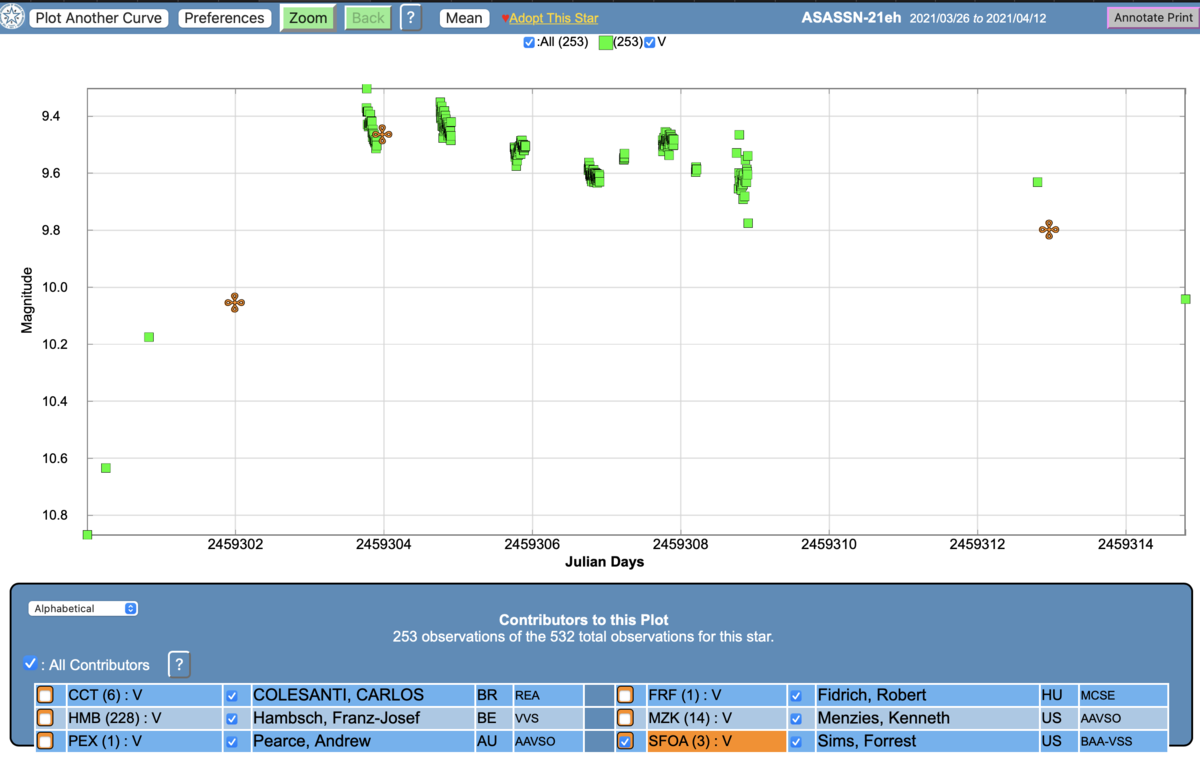 Here is an update on Nova Sgr 2021a from last night. The plot includes my prior observation from 2021-04-08 for comparison. Both spectra are flux calibrated which explains the offset in the graph. I recorded the V magnitude at 11.18 last night and the previous 2021-04-08 observation had it at V mag 9.80.