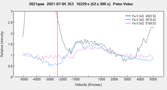 2.3. When we have a series of 3 lines in the range 4900-5200, the most probable identification is the mutiplet Fe II (42) which is the strongest (or at least one the strongest) of Fe II multiplets. The nova is still in the thick Iron Curtain stage.