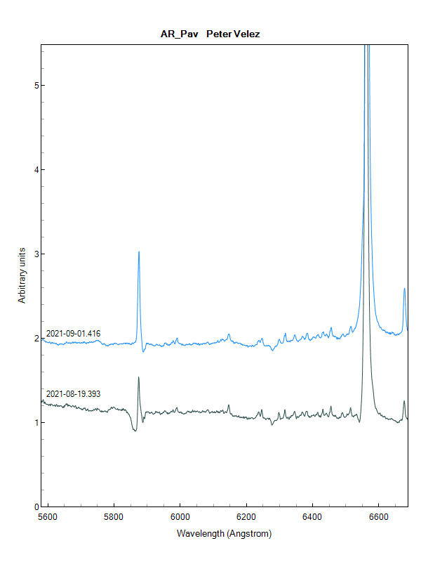 I've continued to monitor the outburst of AR Pav. All observations were taken with UVEX with 600 lines/mm grating on a PW CDK 12.5. I have switched the grating angle a couple of times which has meant that not all observations are directly comparable. That said, there is a reasonable spread of data to look at now. Perhaps I could have been more patient and stayed with a single range of wavelengths.