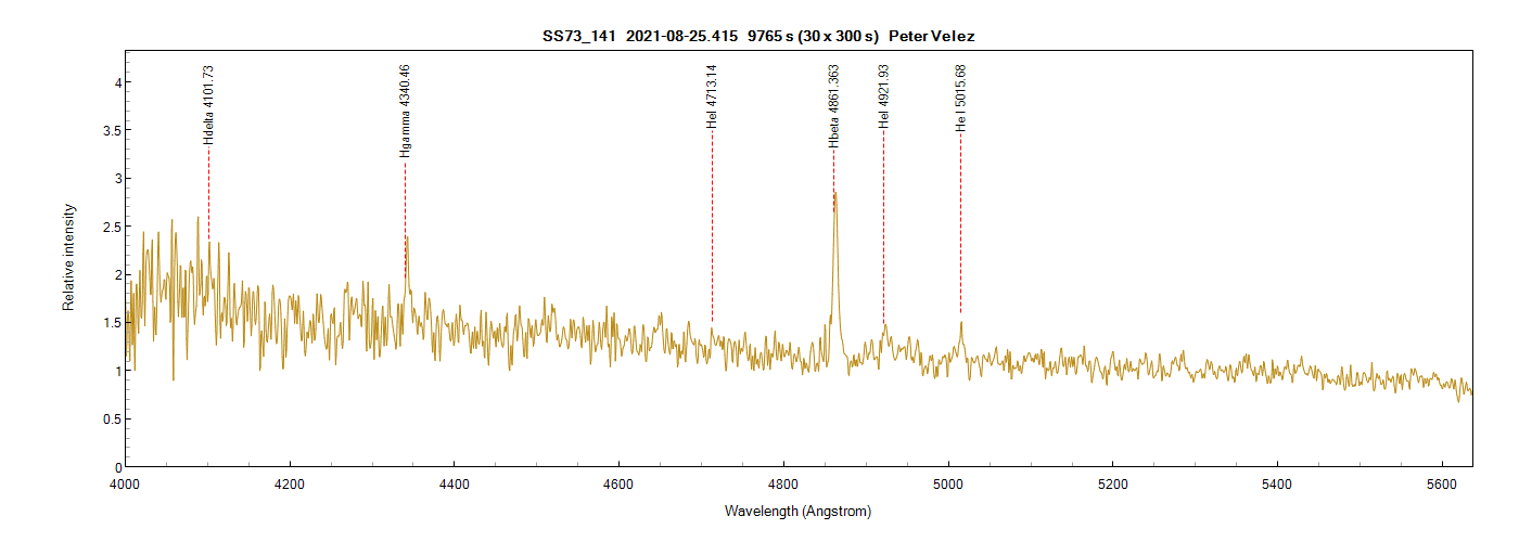 I have annotated what I can. The He I at 4921.9 A looks like a blend with Fe II at 4923.9 A - I didn't mark both as the graph becomes hard to read.The Balmer line emissions look redshifted. I'm reasonably comfortable with the calibration on this one so I can't explain why this might be the case. If I adjust the spectrum to match the Balmer lines, the He I lines are then off. Will leave that to the gurus to explain. Not as much Fe II as I would have expected - but its hard to tell with all the noise.