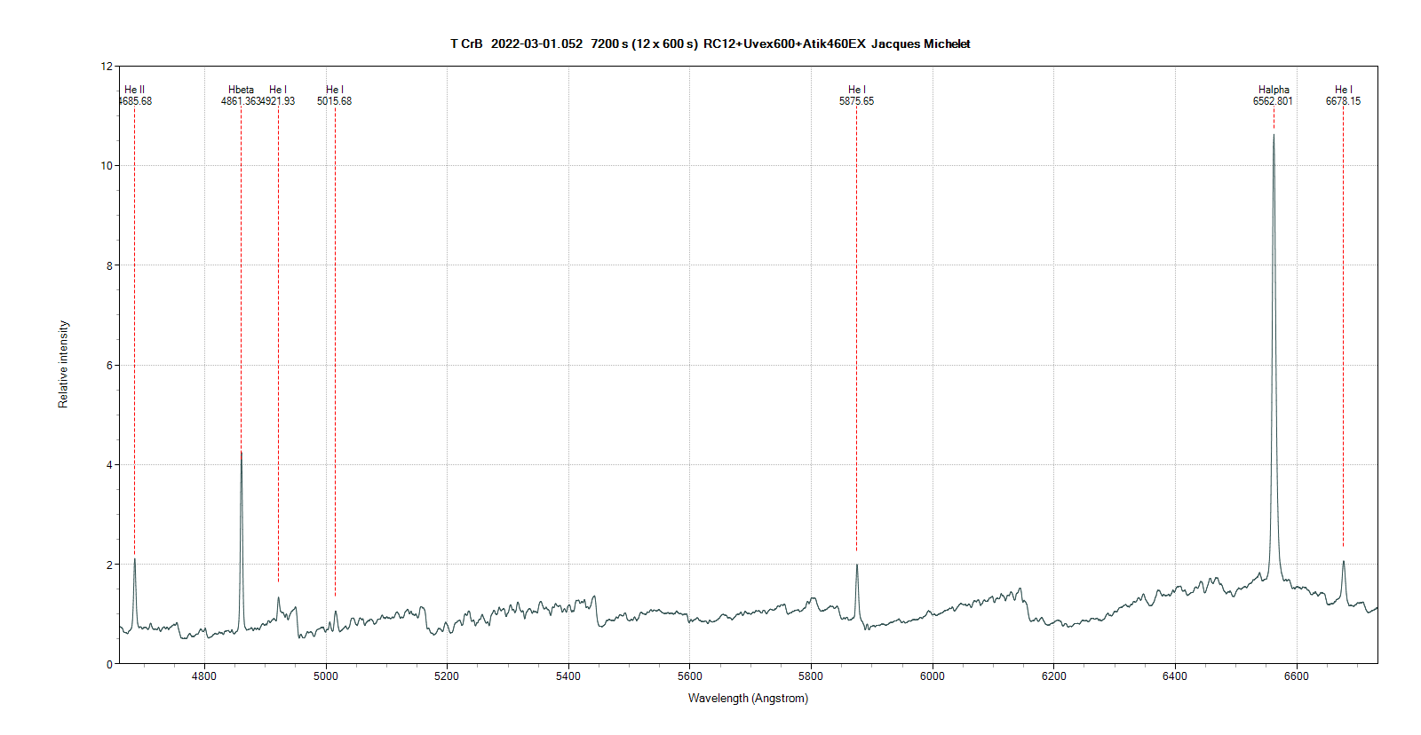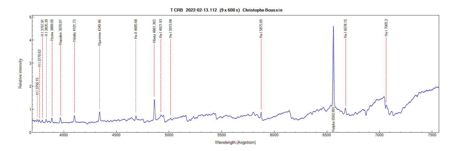 I obtained the following spectrum of T CrB with a spectral range from 3700 to 7565 A the 13th of February at 2 h 41 TU with my Alpy 600 (resolution of 527, JJ = 2459623.6115) and an acquisition time of 90 min (9 x 600 s) :