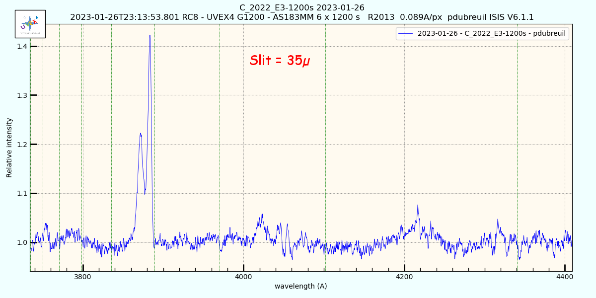Ces derniers nuit, la météo aidant, après avoir installé un réseau 1200TR/mm 400nm, j'ai mis à profit la motorisation de l'UVEX4 avec changement de fente 35µ et 15µ.
