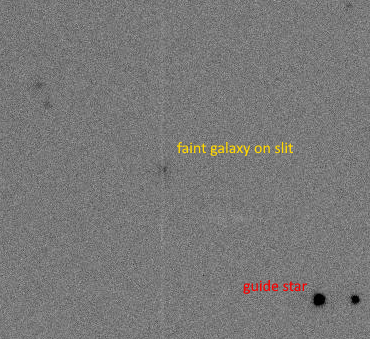 These targets are much to faint to guide directly on so I guide on brighter stars in the same field. (I first take a long exposure and calculate where I need to place the guide star so the target is on the slit)
