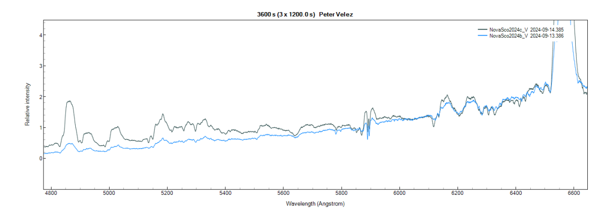 Some spectra on the latest nova in Scorpio. BY way of background, the nova was originally discovered on 2024-09-09.4363 UT at 11.4 mag (unfiltered) (see CBAT notification here:http://www.cbat.eps.harvard.edu/unconf/ ... 28079.html ). It was classified as a classical nova by Yusuke Tampo later that day (see ATel 16808 here:https://www.astronomerstelegram.org/?read=16808 ).