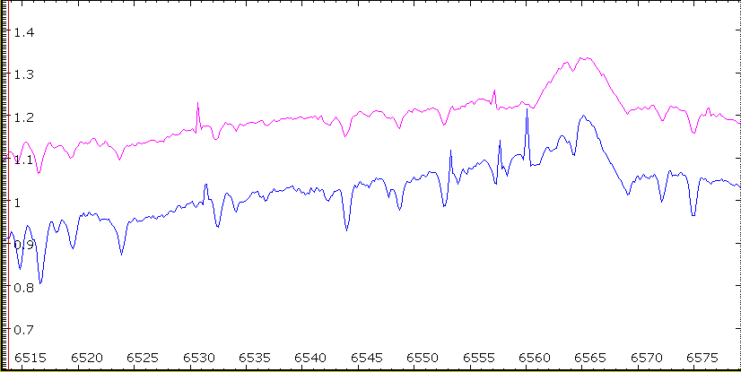 Another picture this time showing two spectra from 4th Oct in blue and 17th Oct in red of the pretty dramatic changes in the Halpha line of Alpha Cam.