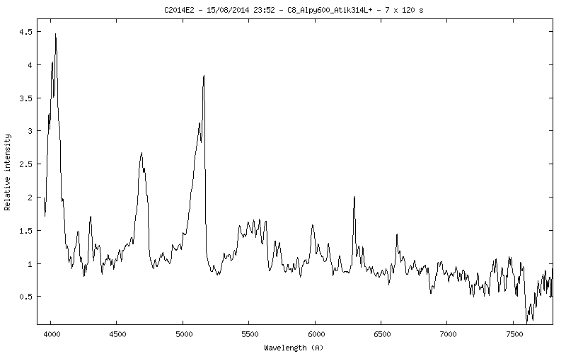 Conditions : pas de vent, QSM 21.3, Meade SC 10" Red 0,63 +Spectro LISA fente 23 Mu, 8x300s, R=1020 guidage sur le noyau de la comète avec des poses de 6s (CCD de guidage Atik 16 HR).