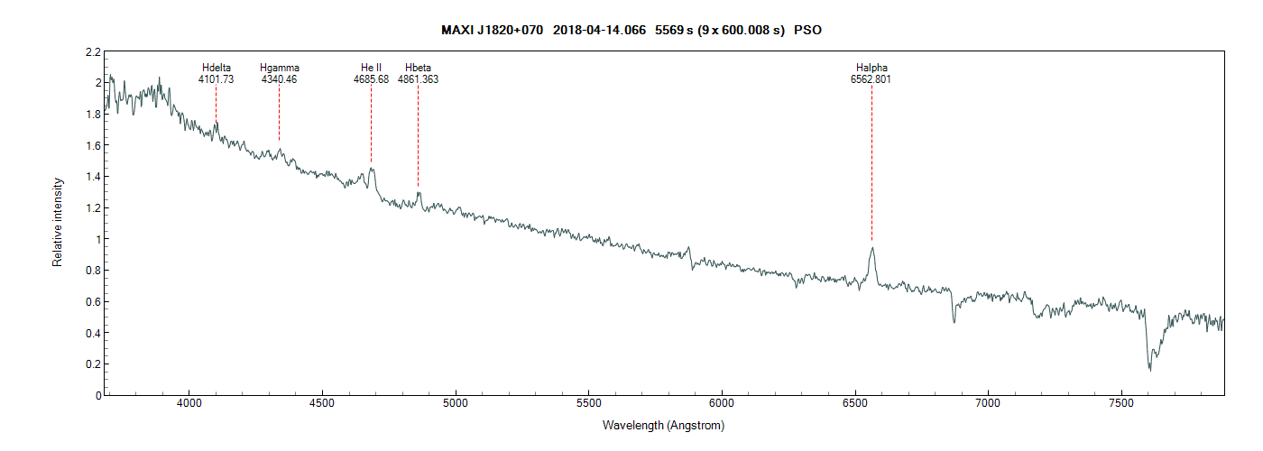 Here is my data from this morning on ASASSN-18ey = MAXI J1820+070. According to the AAVSO Alert notice 630 there is a "blitz" campaign for two nights (thru 13 April) on this object. They want high cadence photometry. But maybe some 600sec images of the spectrum would be of interest.