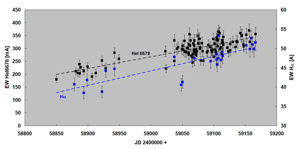 Based on your work on correlation of Halpha and HeI6678 EW´s (see the Fig. below) , it is clear that gCas is in a state now of rapidly building up its disk.