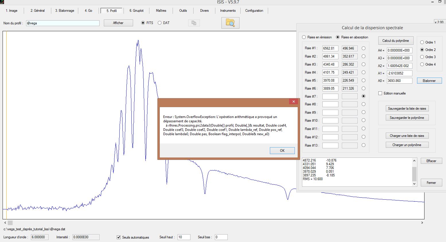 Concernant l'étalonnage en longueur d'onde avec ISIS (avec lequel je débute),j'ai pris, pour m'exercer, les images de Vega disponibles (avec offset, dark , flats) par le lien suivant: http://www.astrosurf.com/buil/isis/guid ... s_2400.zip