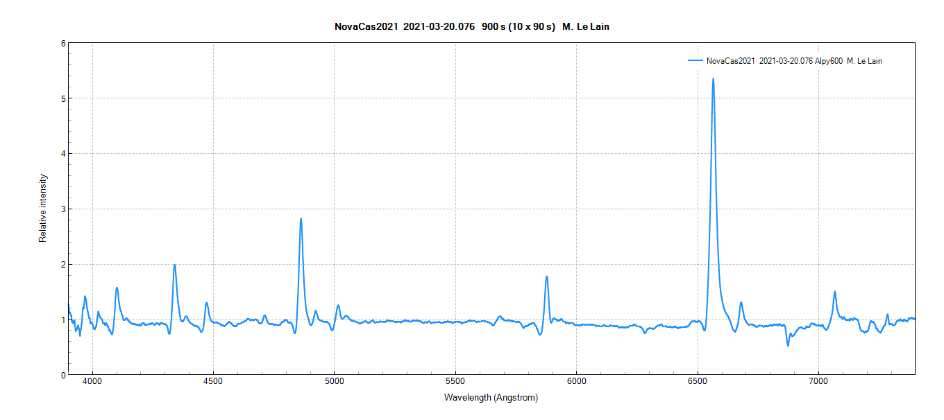The following spectrum was obtained the 20th of March at 19 h 42 TU with my Alpy 600 (resolution of 528, JJ = 2459294.3211) and an acquisition time of 25 min (5 x 300s) :