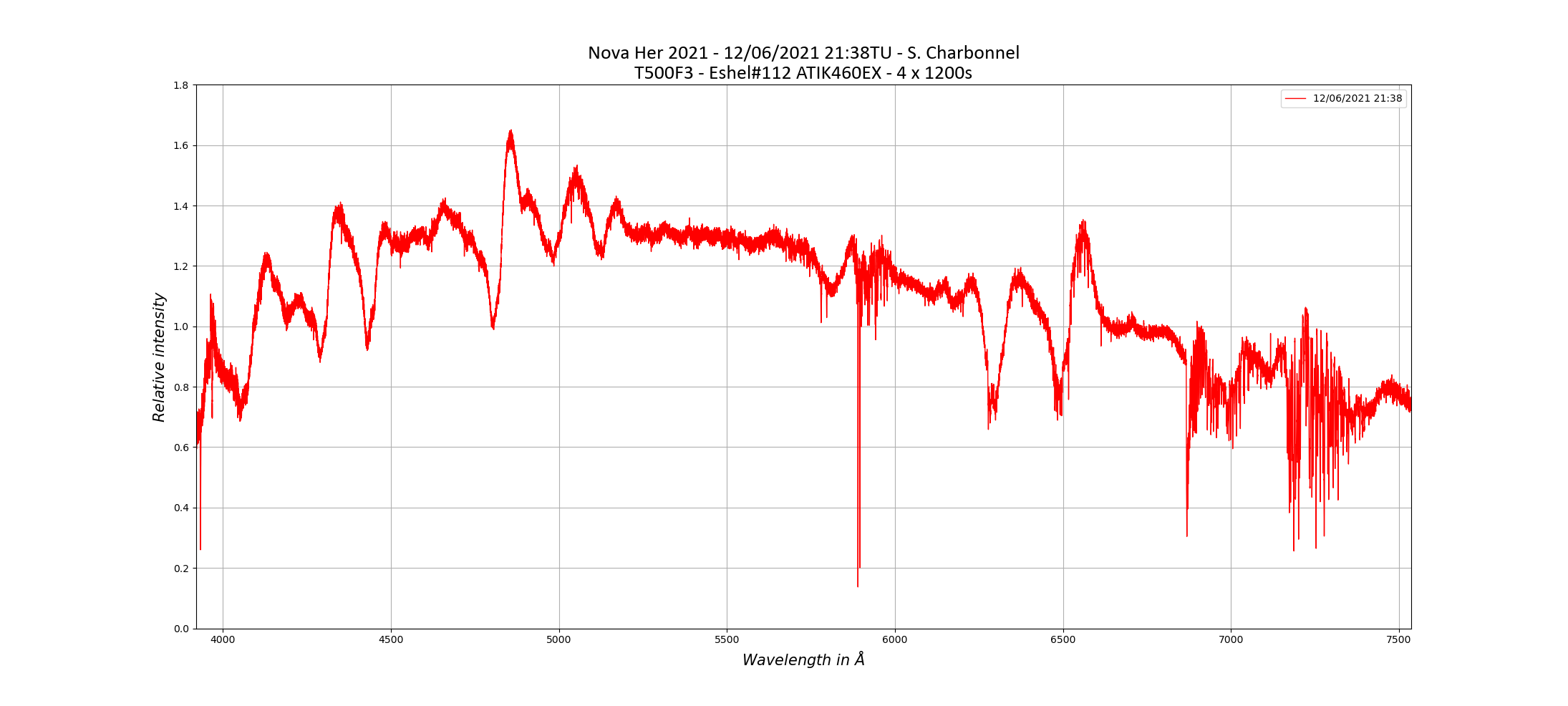 Here is my spectrum of the Nova Her 2021 obtained the 13th of June at 1 h 01 TU (resolution of 531, JJ = 2459378.5425) with my Alpy 600 and an acquisition time of 30 min (6 x 300s) : Clear skies to all !!